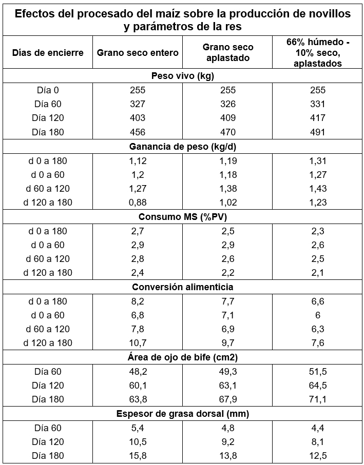 La información sobre la eficiencia de los procesados del grano de maíz en dietas de engorde en la Argentina es contradictoria, en algunos casos el procesado mejora la respuesta y en otros no. Tampoco se reportan efectos comparados sobre parámetros de res y de carne en encierres cortos y largos.